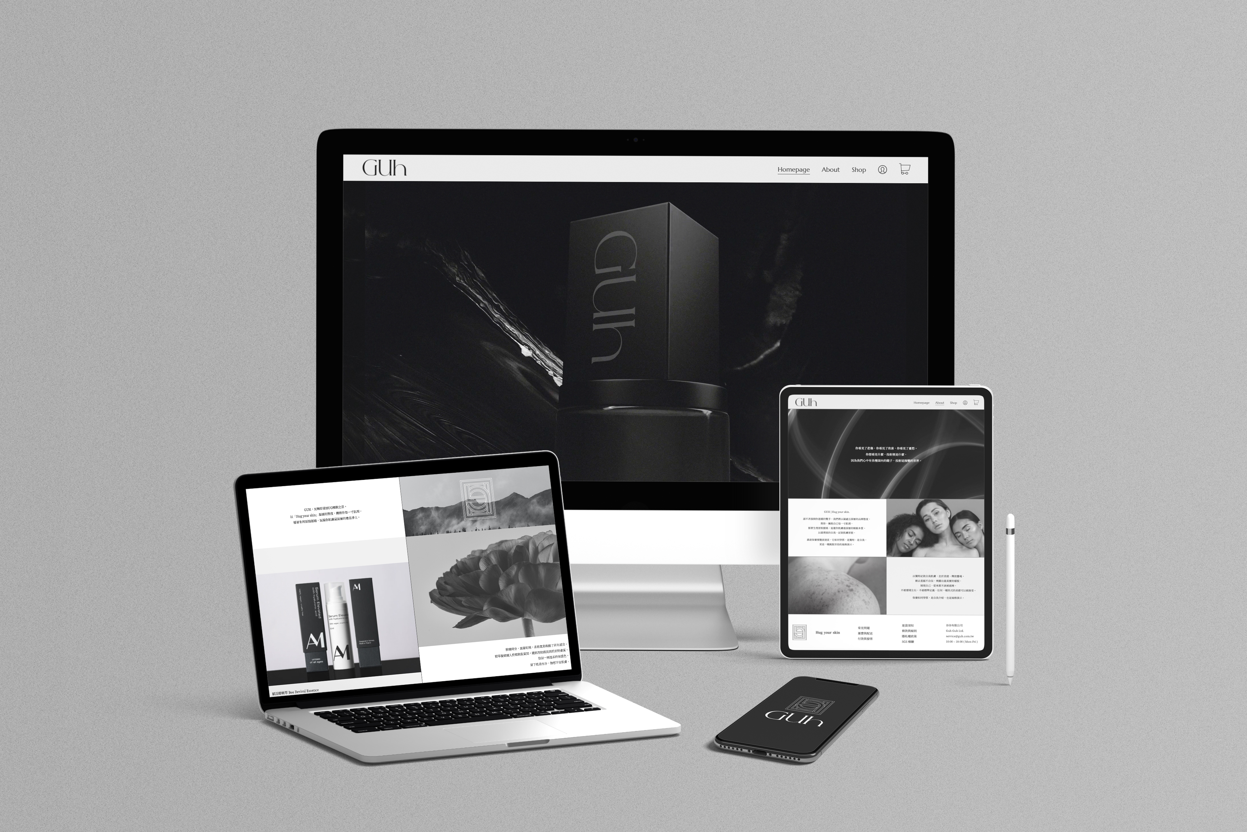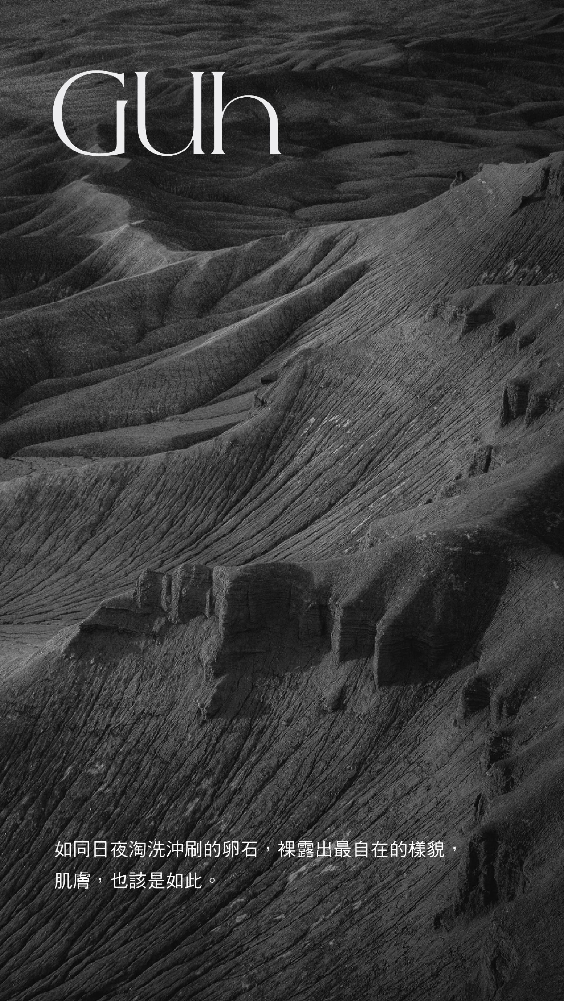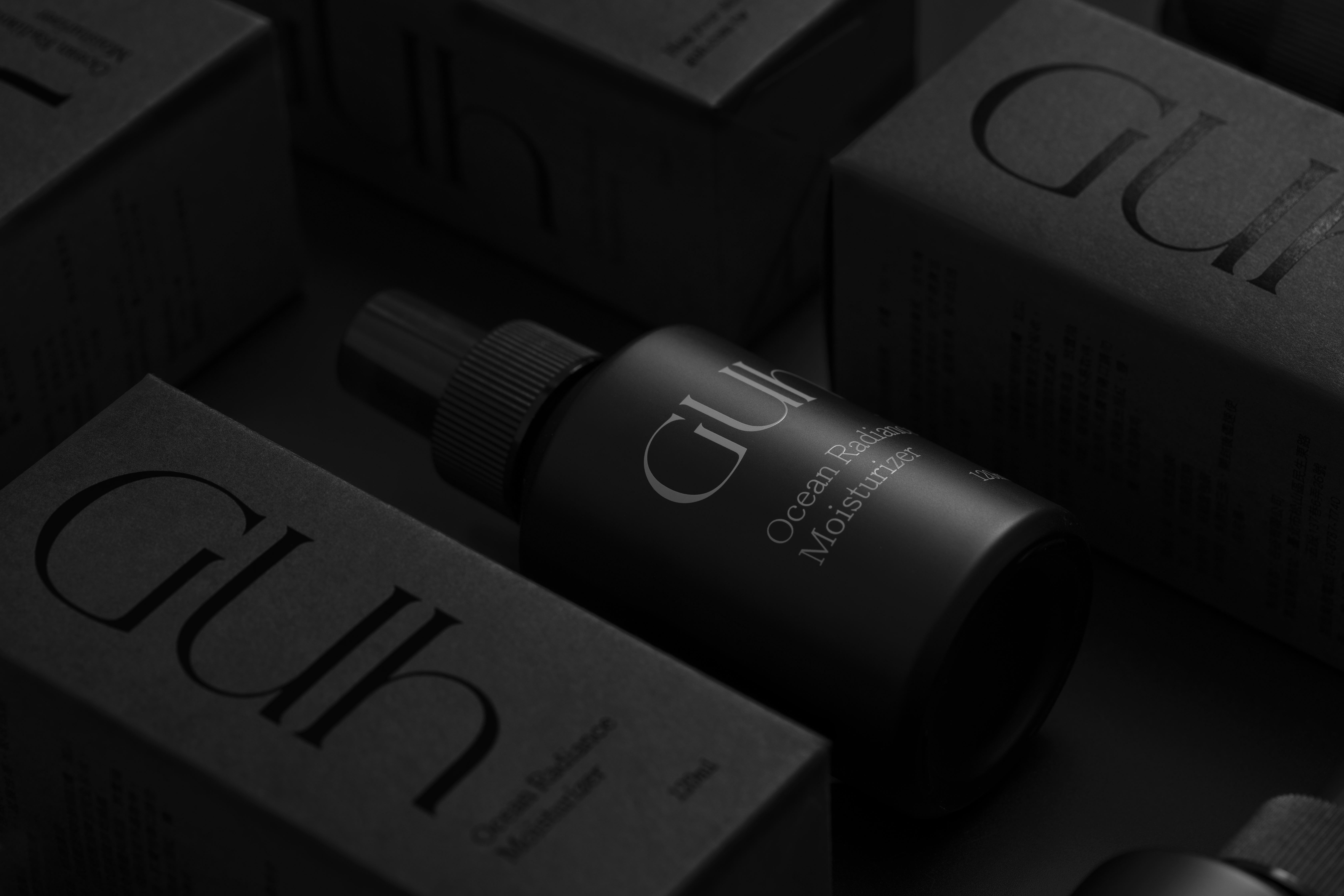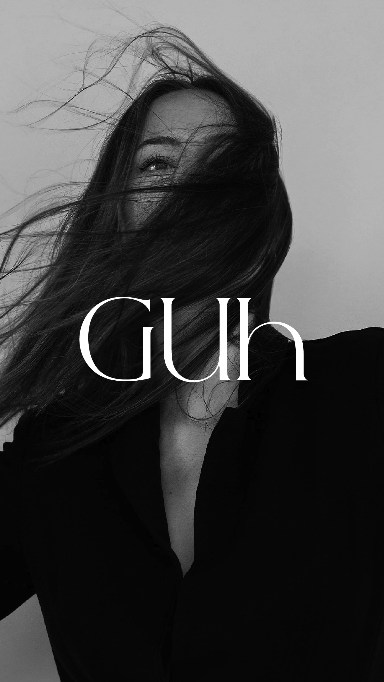 標誌以 「 G、U、H 」 三個英文字母交互纏繞合為一體,彼此相互擁抱亦傳遞出品牌之核心理念 - Hug your skin,無關人種膚色、性別、年齡與性取向,都應該褪去他人所給予的框架,回歸、擁抱天然獨特的自我。標準字以彎曲弧度表達女性溫柔和緩一面,末端襯線設計較銳利,則象徵女性其堅毅獨立一面。