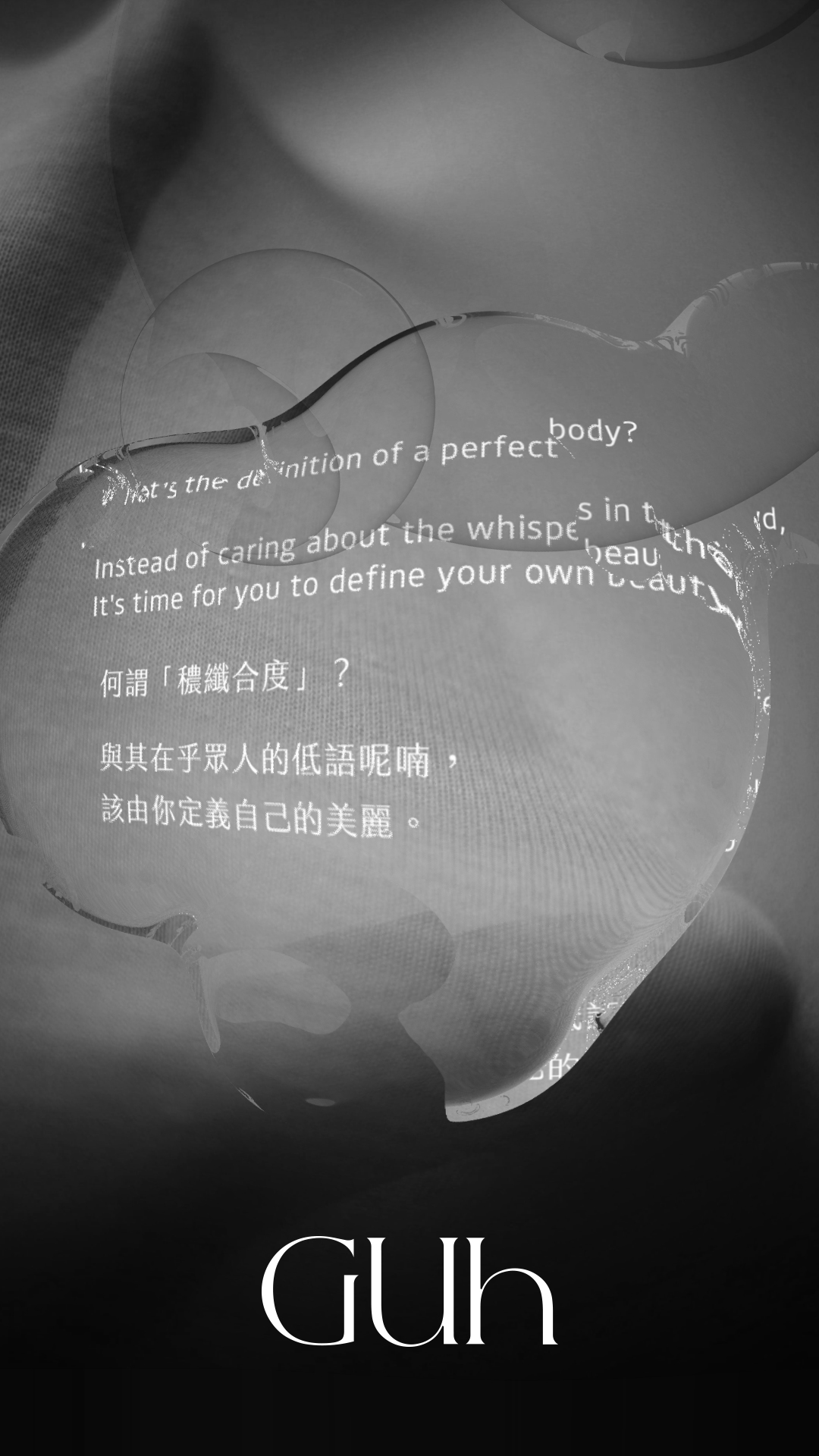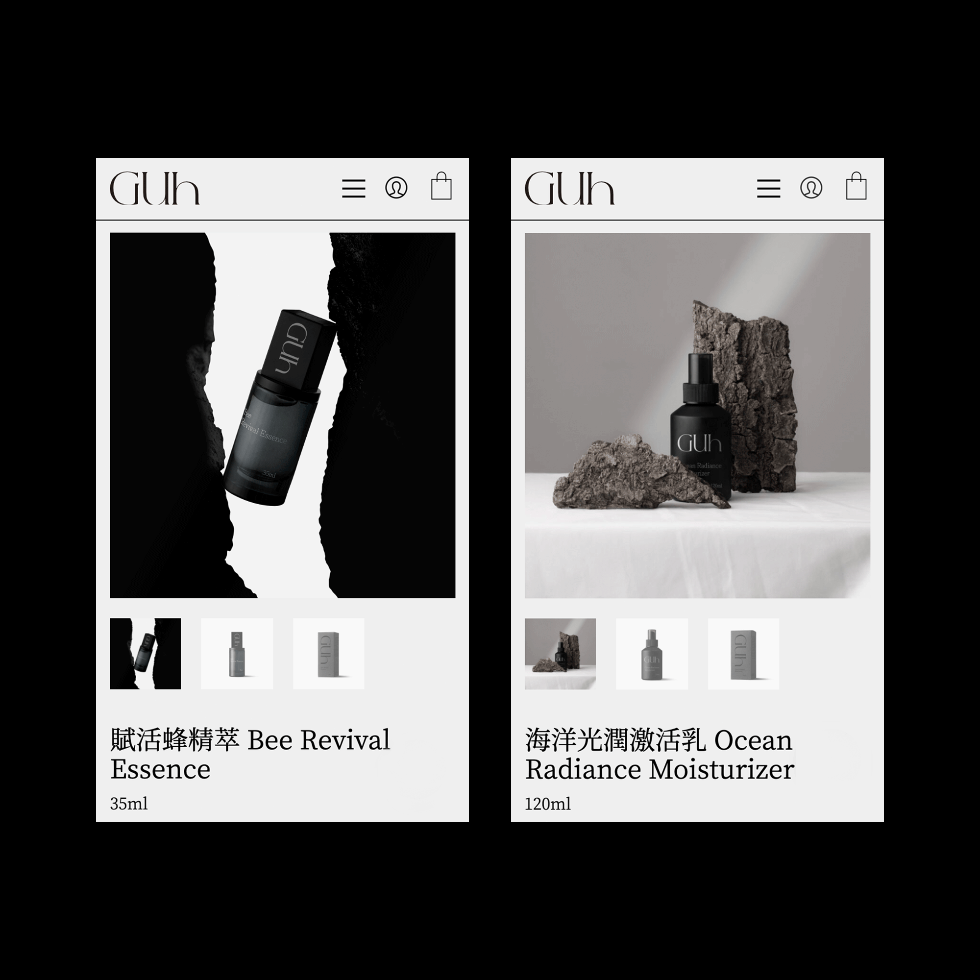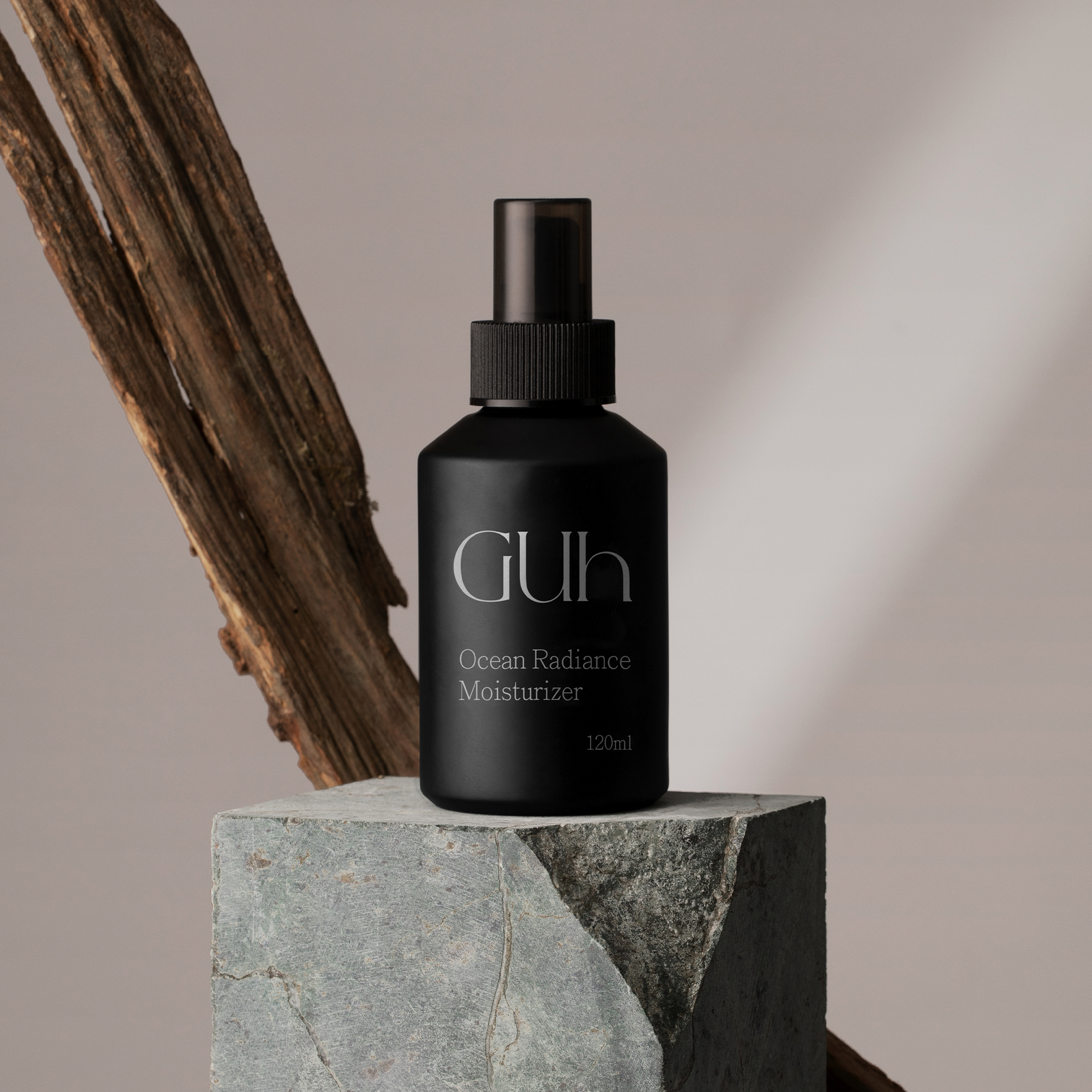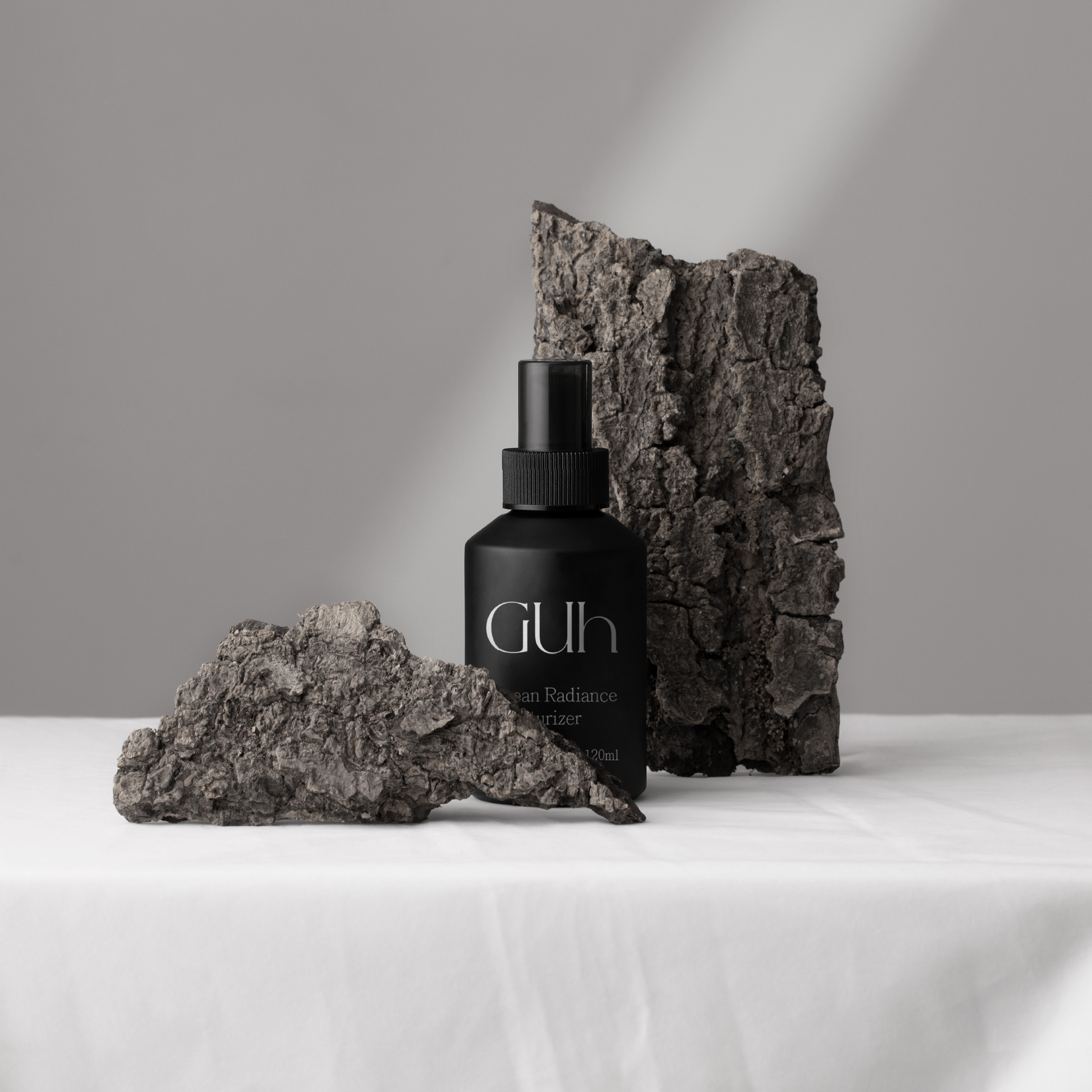 標誌以 「 G、U、H 」 三個英文字母交互纏繞合為一體,彼此相互擁抱亦傳遞出品牌之核心理念 - Hug your skin,無關人種膚色、性別、年齡與性取向,都應該褪去他人所給予的框架,回歸、擁抱天然獨特的自我。標準字以彎曲弧度表達女性溫柔和緩一面,末端襯線設計較銳利,則象徵女性其堅毅獨立一面。