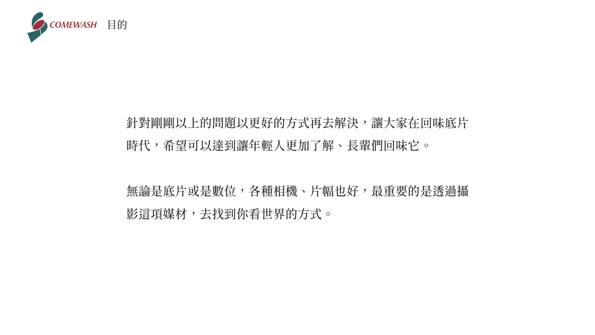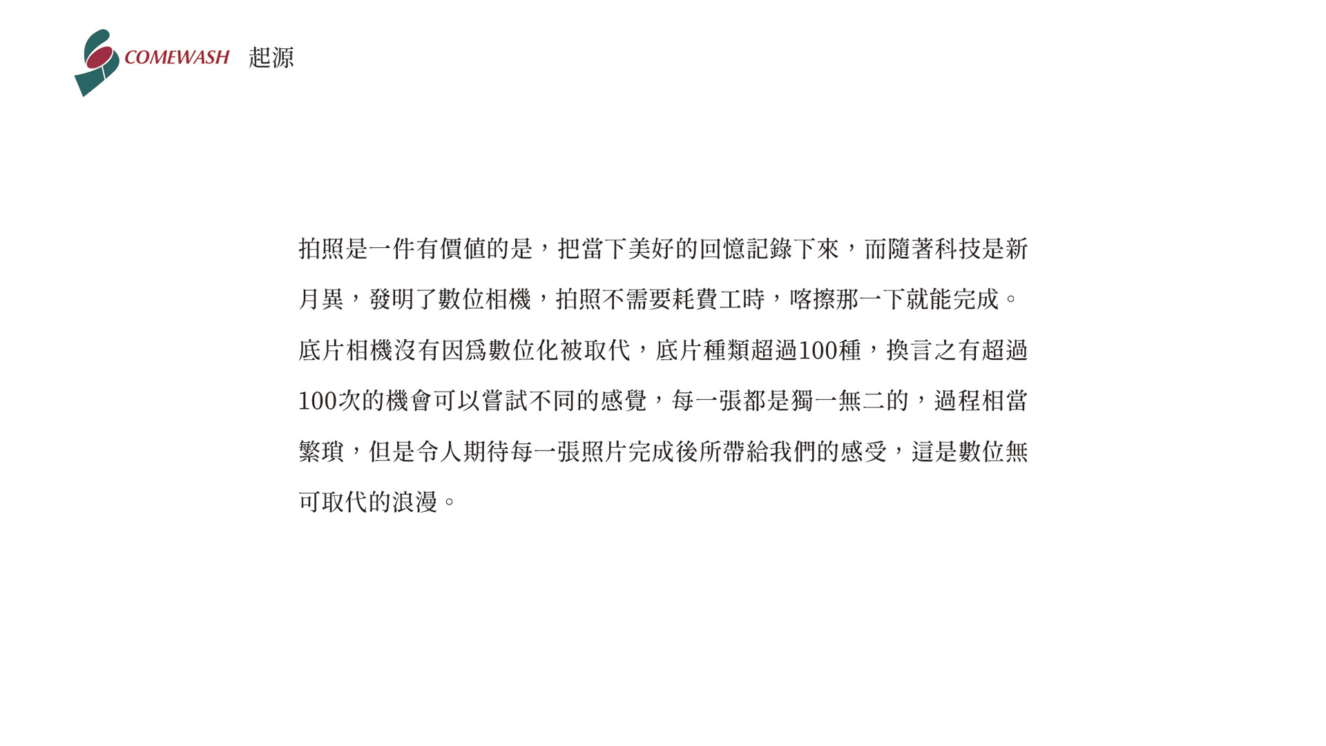 拍照是一件有價值的事,把當下美好的回憶記錄下來,而隨著科技日新月異,拍照不需要耗費工時,喀擦那一下就能完成。底片相機沒有因為數位化被取代,底片種類超過100種,換言之有超過100次機會可以嘗試不同的感覺,每一張都是獨一無二,就算過程相當繁瑣,但是令人期待每張照片完成後,所帶給我們的感受這是數位無可取代的浪漫,也希望讓更多人感受到底片的魅力。